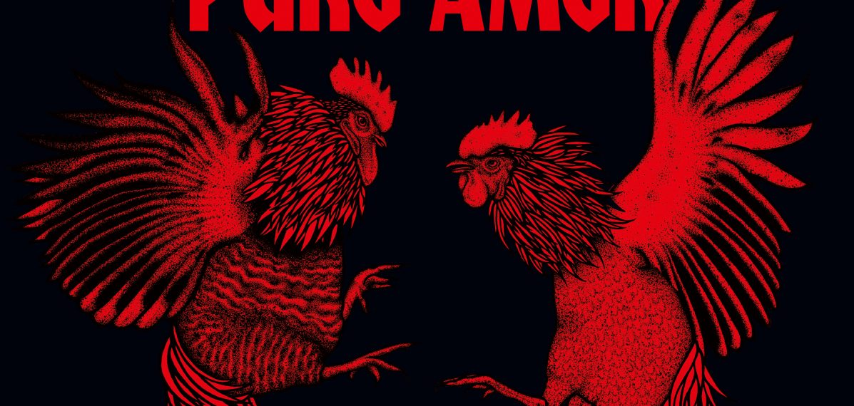 Das Albumcover "Puro Amor" von den Broilers ist schwarz. Die Schrift ist rot und darunter sind zwei Hähne im Kampf zu sehen, ebenfalls in rot.